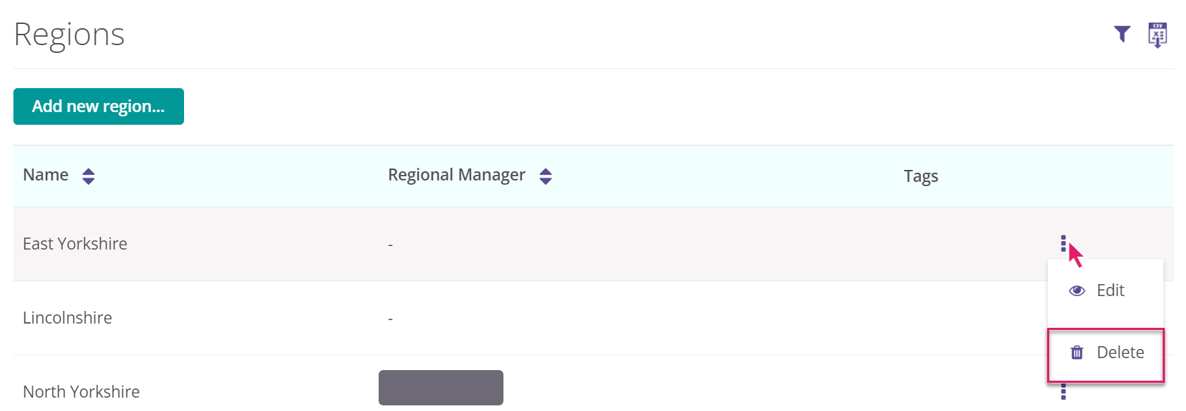 - Find the Region and select the 3-dots next to it. Select Delete.