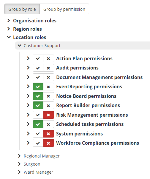 | Manage Access Control | Can configure the parts of the system each role can access. A user with Manage Access Control permission can set the access across the entire organisation, regardless of the scope of the user’s role. E.g. a Location or Region role user with Manage Access Control assigned, will be able to set the access permissions for all roles across the entire system and will not be limited to just the user’s own Location or Region. A user with the Manage Access Control permission can manage all system permissions, regardless of any other permissions assigned to them. |