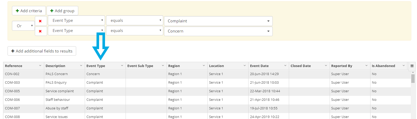 From the next two drop downs, you can then filter down your selected criteria, for example, below we have set the report to only show Event Types that equal Complaint. This means, once we click run, our report will only show complaints.