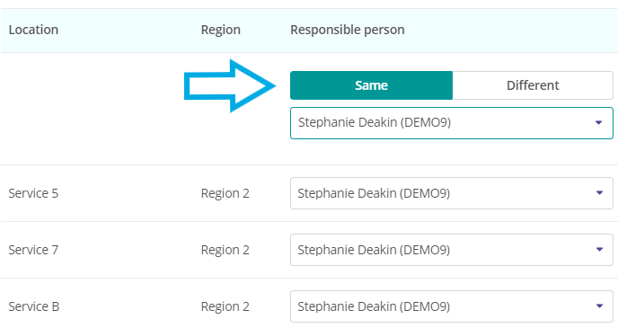 - If you have selected multiple locations you have the option to quickly assign the same user to every location. To do this select Same at the top of the location list and select the user who will responsible for completing the task at every location: