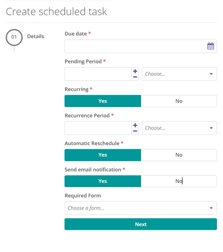 - Required form. Would you like to assign a form to be completed as part of the scheduled task? The form must be created first in the Form Editor and published as a Scheduled Tasks form. Please see our separate guidance on the Form Editor for more information.