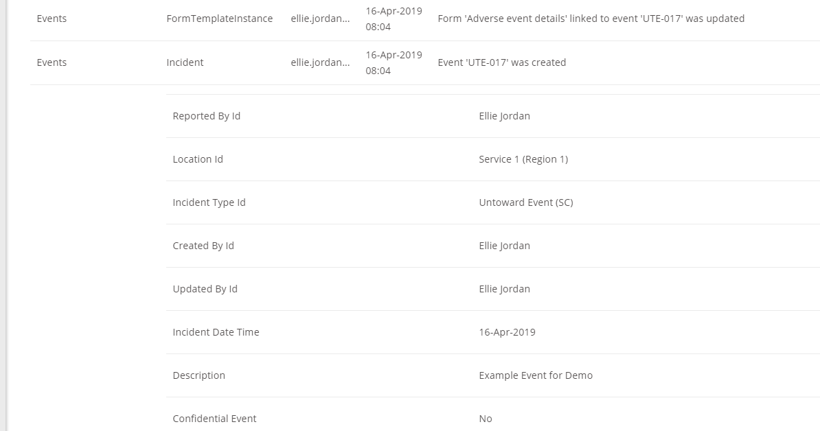 From this table, you can click on any of the items to reveal more information, e.g. below, the item "Event 'UTE-017' was created" has been clicked on to reveal details about who reported the event, the location, the event type, etc.: