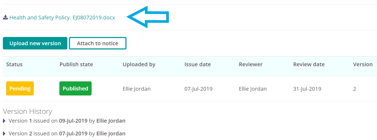Here you can see the document awaiting review, along with other details such as the version history. Click on the document link to download the current document.