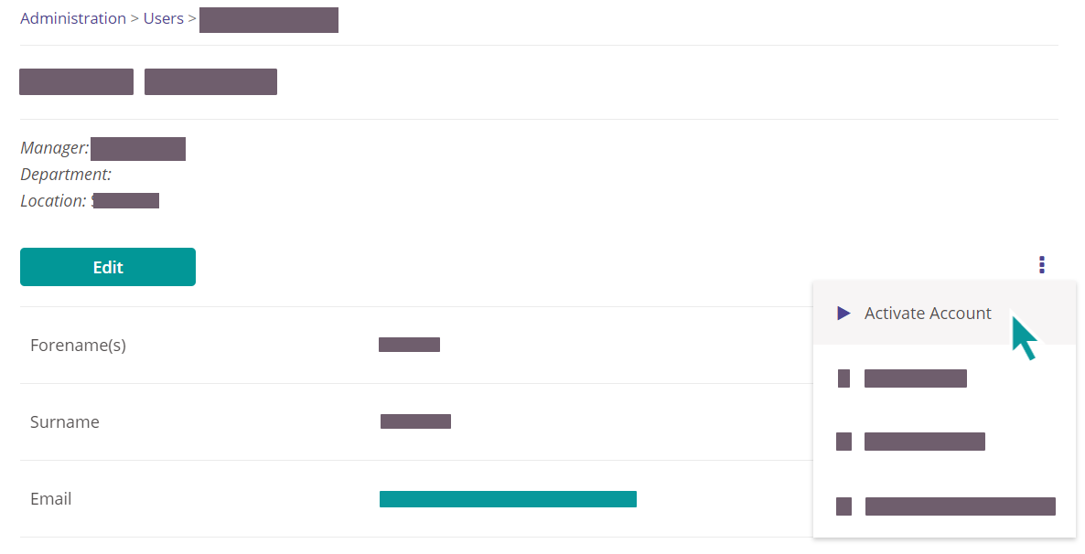 - Or, click on a User from this list to view their details. From within the User details page, select the three-dot menu icon and select Activate Account.