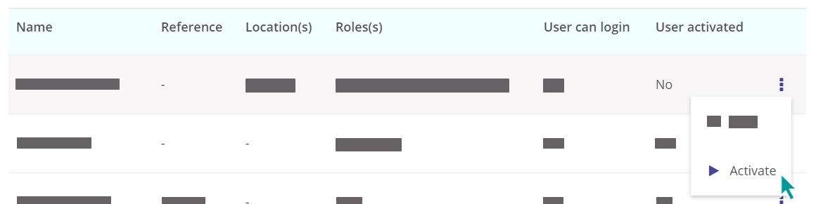 - To activate a user, select the three-dot menu icon on the right-hand side of the user and select Activate.