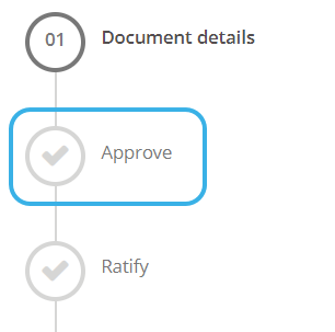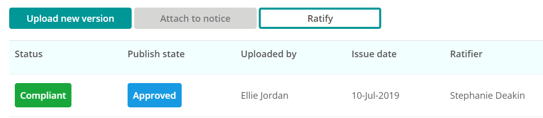 If the document requires Ratification, the Publish state will update to Approved and the action button will update to Ratify. The document will not be published until it has been ratified.
