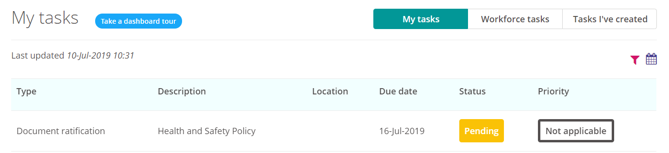 If you have been assigned as the Ratifier for a document, the document will appear on your dashboard once the pending period is reached. Click on the task from this list to be taken to the document details page.