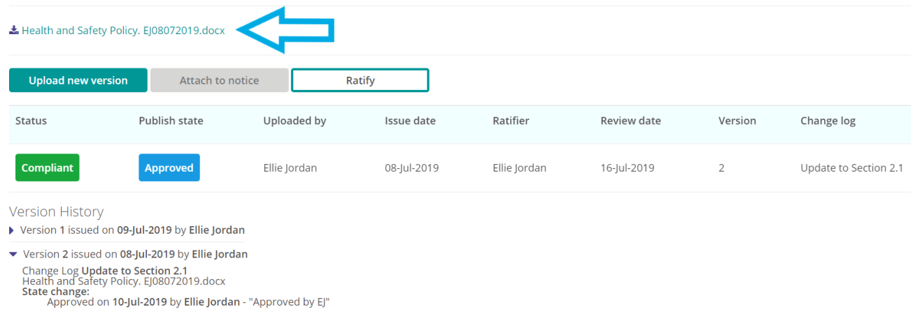 Here you can see the document awaiting ratification, along with other details such as the version history and approval notes (if applicable). Click on the document link to download the current document.
