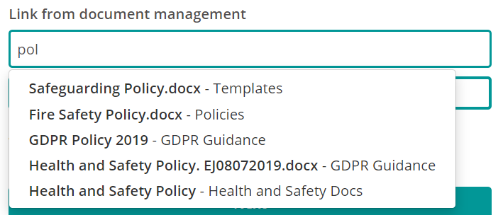 You can add attachments to your notice, should you wish to do so. To add a document that is saved within the Documents section of Radar Healthcare, use the Link from document management option. Start typing the name of a document saved in your documents section of Radar Healthcare and select from the list.
