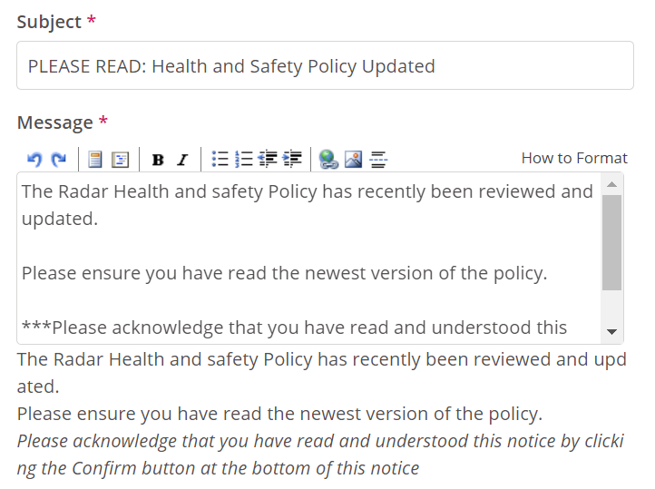 Type the Subject and body of the notice that you would like to send to your users. A preview of the notice as it will appear to your users is shown below the text box.