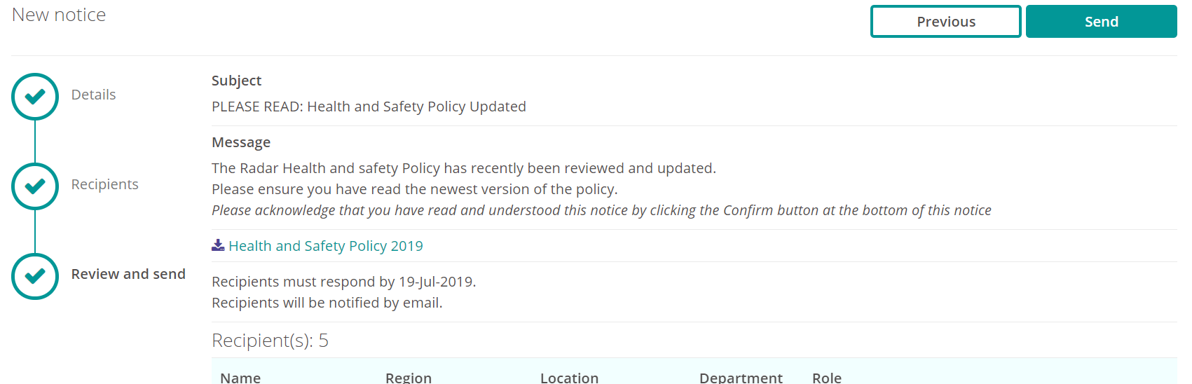 Choose whether you would like recipients to acknowledge receipt of the notice or not. If recipients must respond, select a date a deadline by which they must respond.