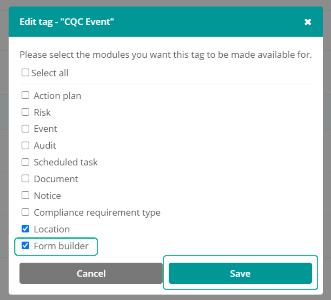 Enter the name of the new Tag and choose the modules you wish to use it for. For our purposes we need to include Form builder and save.