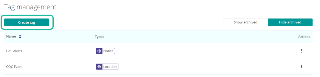 You'll now be presented with any existing Tags you have in place. Tags can be used across multiple modules within Radar Healthcare. For this purpose we are interested in Form builder Tags.