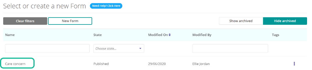 Select the Form you wish to add this Tag to by choosing the name.