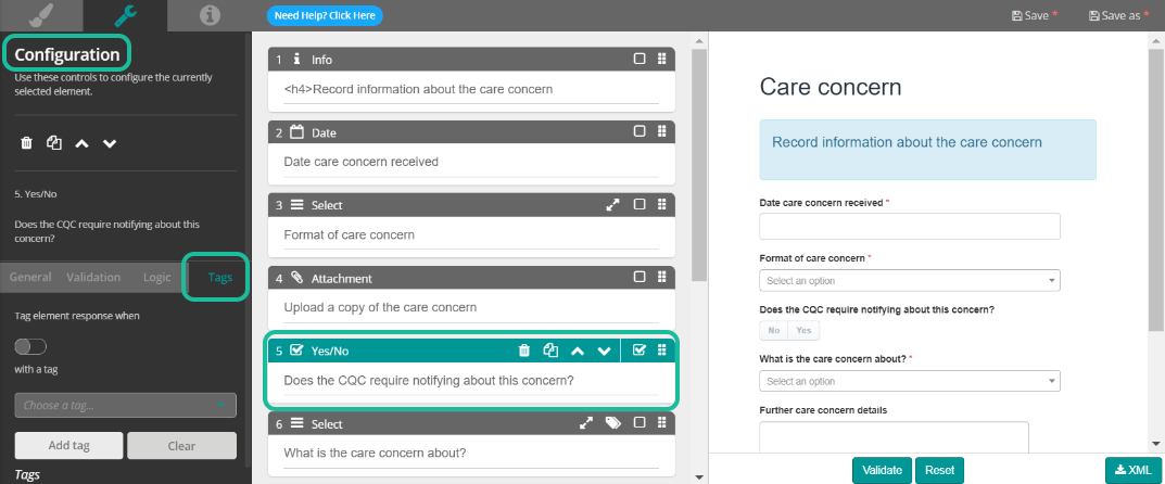 Choose the question you wish to add the Tag to, and select Tag on the Configuration panel.