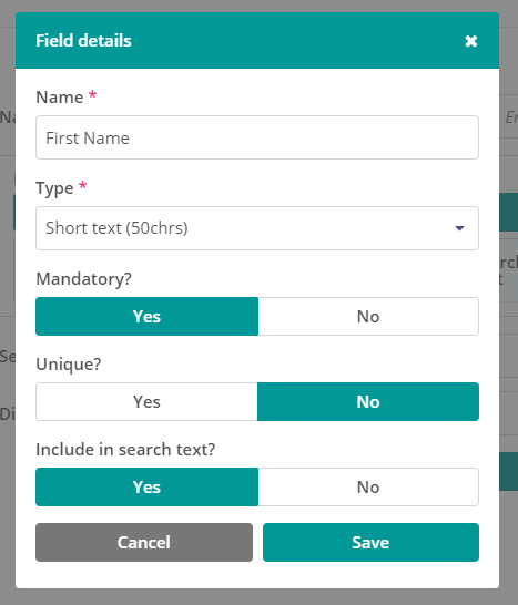 Type - what sort of data is being captured? The above example it is a text field, however, it might be numeric, a date, email address, boolean (Yes/No), select (drop down list) etc. Selecting the right one means you can ensure the right type of data is being recorded.