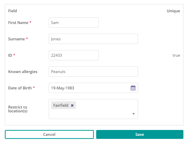 Unique? - can multiple entities with the same information be entered into our new enhanced custom list? In our example it's very likely service users may have the same first name so we'll select No. If you were creating a field to capture an NHS number we would set this to Yes.