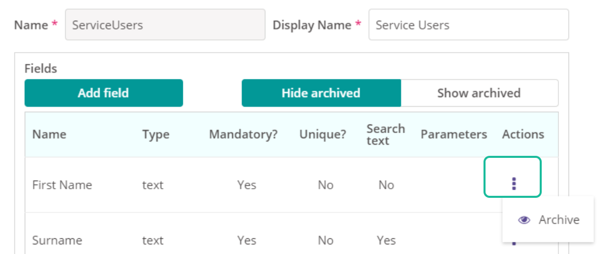 From here you can archive a field using the 3-dot menu next to its name: