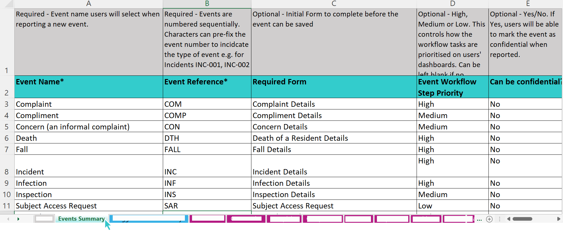 Every organisation has a spreadsheet that documents the workflow configuration in your Live Radar Healthcare system. This spreadsheet is available upon request from the Support team or your Customer Success Manager.