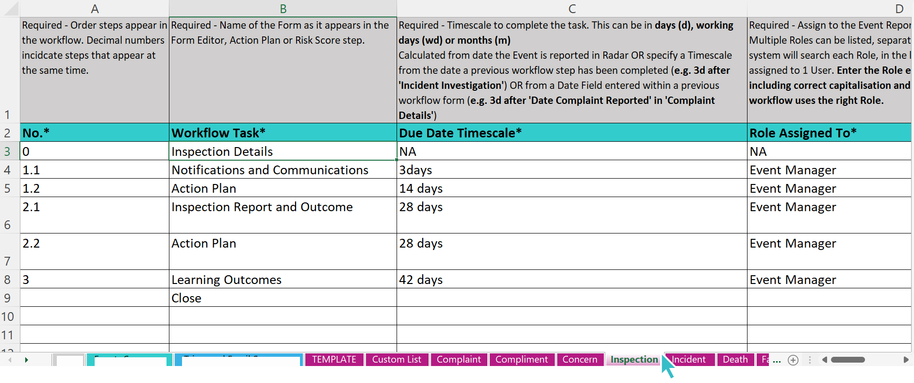 Task Number (Required) | The order in which the workflow steps present. Step ‘0’ represents the ‘Required Form’ that is completed when the event is reported. Decimal numbers indicate steps that appear at the same time e.g. 2.1, 2.2, 2.3 |